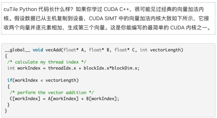 根据英伟达的技术博客,我们可以通过一个向量加法的例子来感受cuTile的变革。
