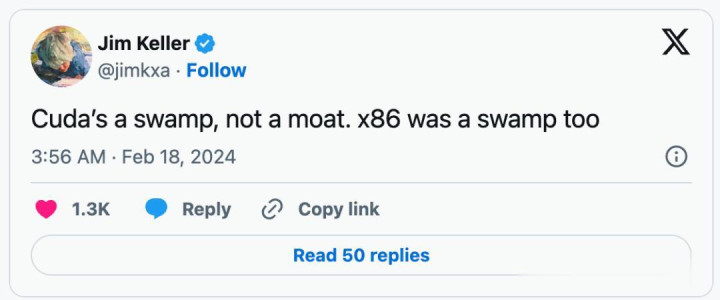 去年,Jim Keller曾直言「CUDA是沼泽而非护城河」。